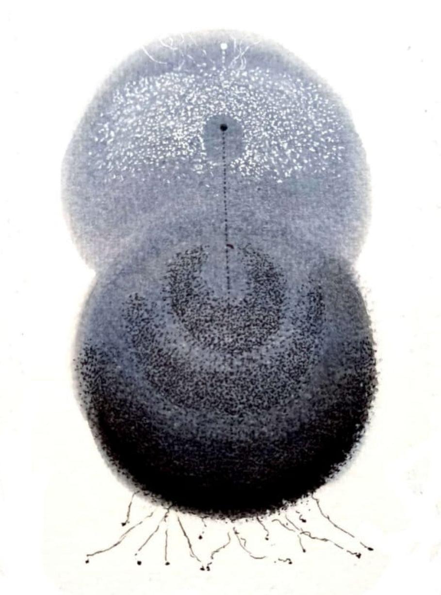 This abstract image depicts two overlapping circles, one light and one dark, suggesting the interplay between opposing forces. A line descends from the center of the lighter circle, connecting to a cluster of lines at the bottom, symbolizing the roots that ground and nourish the upper realm. The overall composition evokes a sense of interconnectedness, balance, and the harmony between duality and unity.