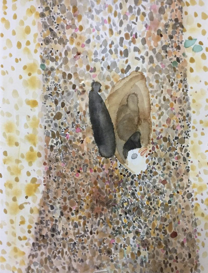 An abstract watercolor artwork with a focus on a central form that resembles a seashell or a unique object. The surrounding area is filled with a dense field of dots and subtle colors, creating a sense of mystery and intrigue. The artwork invites viewers to explore and discover the hidden details within the composition.