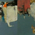 This abstract painting evokes a sense of a distant landscape, shrouded in mist and mystery. The artist's use of layered textures and muted colors creates a dreamlike atmosphere. The interplay of earthy tones, greens, and hints of yellow suggests a landscape bathed in soft light. The overall composition invites contemplation and invites the viewer to imagine their own interpretation of the scene.