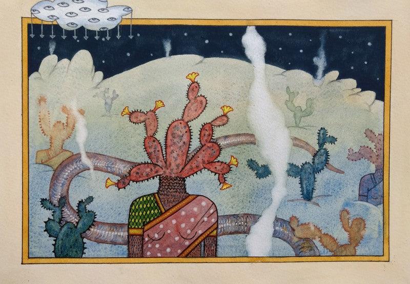 This intriguing artwork portrays a woman in a vibrant sari, her head crowned with a flowering cactus, standing amidst a surreal desert landscape. A cloud with multiple eyes sheds rain upon the scene, adding to the dreamlike atmosphere. The artwork blends elements of the natural world with human form, inviting viewers to interpret the symbolism and narrative within this unique composition.