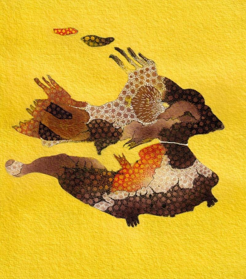 This abstract artwork evokes a sense of flight and movement. The artist has used a combination of washes, drips, and splatters to create a dynamic composition with fluid shapes and contrasting textures. The vibrant yellow background provides a striking contrast to the black and orange ink, creating a sense of energy and dynamism.