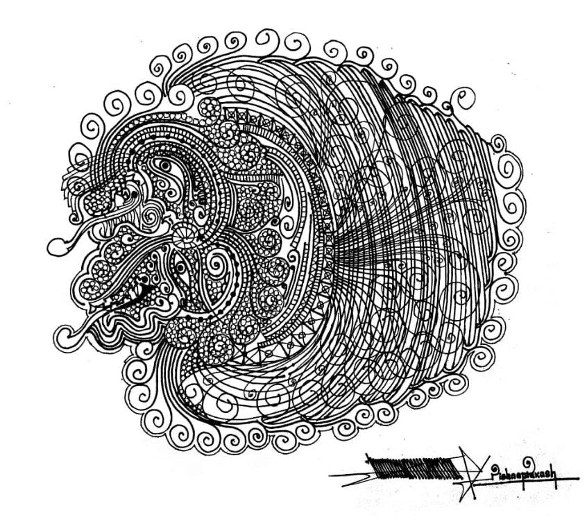 This mesmerizing drawing depicts a circular composition filled with intricate lines, swirls, and patterns. The artist's use of delicate line work and shading creates a sense of energy and movement. The image invites viewers to explore the depths of their imagination and discover the hidden meanings within the intricate patterns.