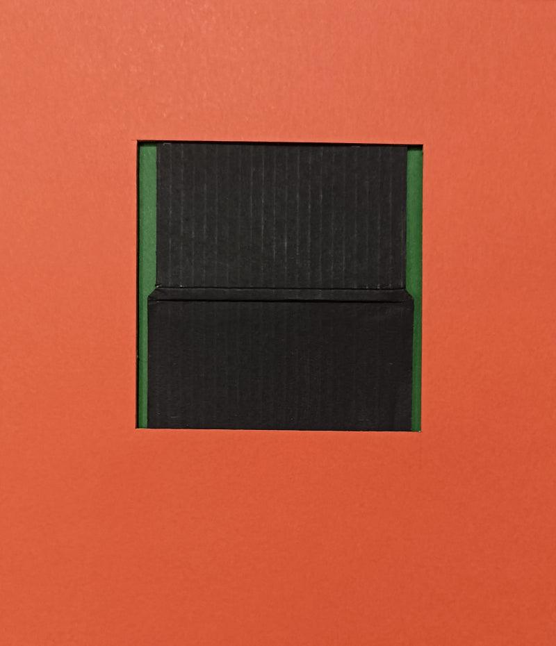 This captivating abstract painting presents a simple window frame, composed of a black rectangle within a green frame, set against a vibrant red background. The artist's use of bold colors and clean lines creates a sense of order and harmony. The minimalist approach emphasizes the power of simplicity, inviting the viewer to contemplate the relationship between the interior and exterior spaces. The overall composition is both serene and thought-provoking, encouraging the viewer to appreciate the beauty of everyday objects.