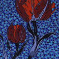 This captivating painting showcases a vibrant arrangement of tulips against a textured blue background. The artist's use of bold colors and expressive brushstrokes creates a sense of energy and movement. The intricate details of the flowers, including the petals, leaves, and stems, are rendered with precision and care. The overall composition is harmonious and balanced, inviting viewers to appreciate the beauty of nature.