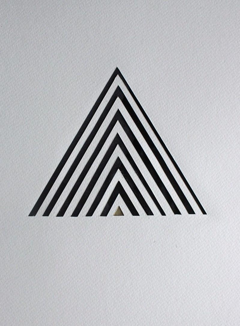 This paper cut artwork features a striking pyramid shape composed of overlapping black lines. The lines create a sense of depth and movement, drawing the viewer's eye towards the apex. A small gold triangle at the center adds a subtle touch of contrast and elegance. The artwork evokes a sense of order, hierarchy, and the concept of building towards a summit.