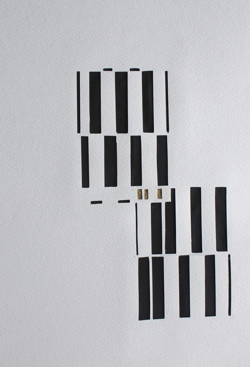 This abstract geometric composition presents a series of black and white lines arranged in a checkered pattern. The pattern is then disrupted by a section of golden lines, creating a visual tension and drawing the viewer's eye to the point of contrast. The composition explores the interplay of order and chaos, repetition and disruption, and the power of a single element to alter the perception of the whole.