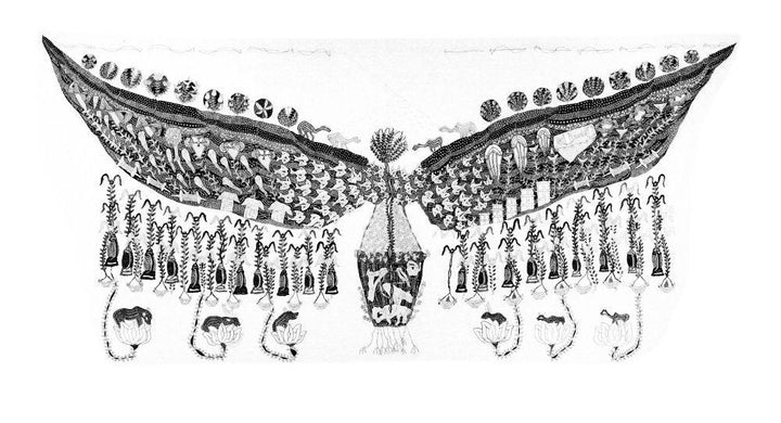 This intricate ink drawing by Santosh Rathod features a majestic figure with outstretched wings, embodying the role of a celestial guardian. The wings are adorned with a fascinating array of symbols, figures, and patterns, suggesting a connection to both the earthly and spiritual realms. The detailed artwork invites the viewer to explore its rich imagery and contemplate the deeper meanings embedded within.