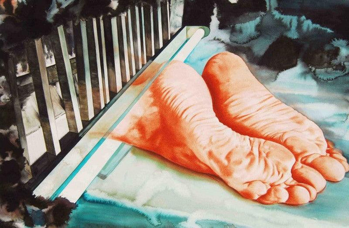 The painting depicts a pair of feet resting on a surface, with a metal grate or bars obscuring the view. The vibrant orange of the feet contrasts with the cool tones of the background, creating a sense of tension and confinement. The artwork invites contemplation on themes of freedom, restriction, and the human condition.