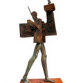 This surreal sculpture depicts a figure carrying a heavy burden, represented by a complex arrangement of wooden structures. The figure's determined expression and the weight of the load suggest a sense of struggle and perseverance. The contrast between the human form and the mechanical elements creates a visually striking and thought-provoking image. This artwork invites contemplation on themes of human resilience, the weight of responsibility, and the challenges of the modern world.