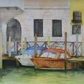 A watercolor painting by Niharika Gupta depicting boats moored on a Venetian canal.