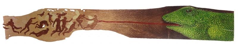 This striking artwork presents a stark contrast between a vibrant green lizard and a stream of human figures seemingly being consumed by it. The imagery suggests a commentary on environmental destruction, overconsumption, or the destructive nature of unchecked greed. The lizard, with its detailed scales and intense gaze, dominates the composition, symbolizing the power of nature or the consequences of human actions. The elongated format and contrasting colors further emphasize the tension between humanity and the natural world.