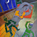 The painting by Santanu Nandan Dinda depicts a woman sleeping peacefully, while two puppet-like figures dance around her. The moon hangs in the night sky, casting an ethereal glow over the scene. The vibrant colors and bold lines characteristic of the artist's style create a sense of dreamlike wonder. The painting evokes a sense of mystery and the subconscious, inviting viewers to explore the depths of their own imaginations.