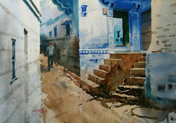 This watercolor painting captures a vibrant scene from a rooftop in a bustling Indian city. Buildings and rooftops create a maze of colors and textures, while a temple with its colorful domes stands out as a beacon of spirituality. The artist skillfully uses light and shadow to create depth and dimension, bringing the cityscape to life.