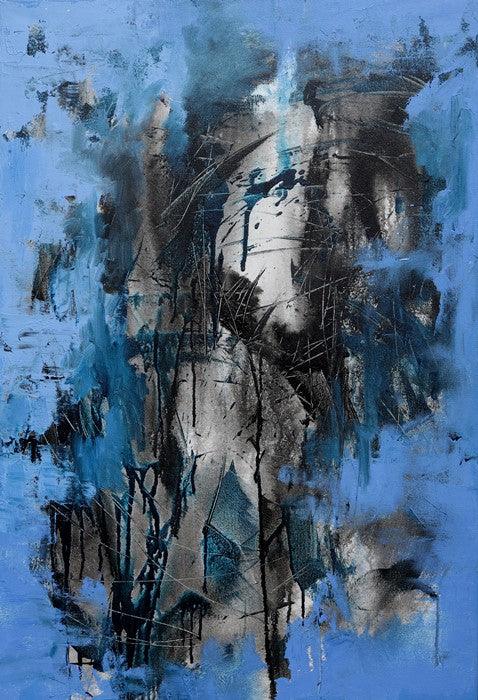 This captivating abstract painting delves into the complexities of the human form, shrouded in layers of paint and texture. The artist employs a bold palette of blues and blacks, creating a sense of mystery and depth. The figure, emerging from the abstract background, is both present and obscured, inviting the viewer to contemplate the hidden depths of the human psyche. The overall impression is one of introspection and the enigmatic nature of the human experience.
