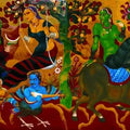 This vibrant painting depicts a mythological scene, possibly from Hindu mythology. A group of figures, including gods, goddesses, and mythological creatures, are depicted in a lush, fantastical landscape. The bold use of color and the expressive brushwork create a sense of dynamism and energy. The figures, with their stylized features and elongated limbs, suggest a connection to traditional folk art. The overall impression is one of myth, legend, and the divine.