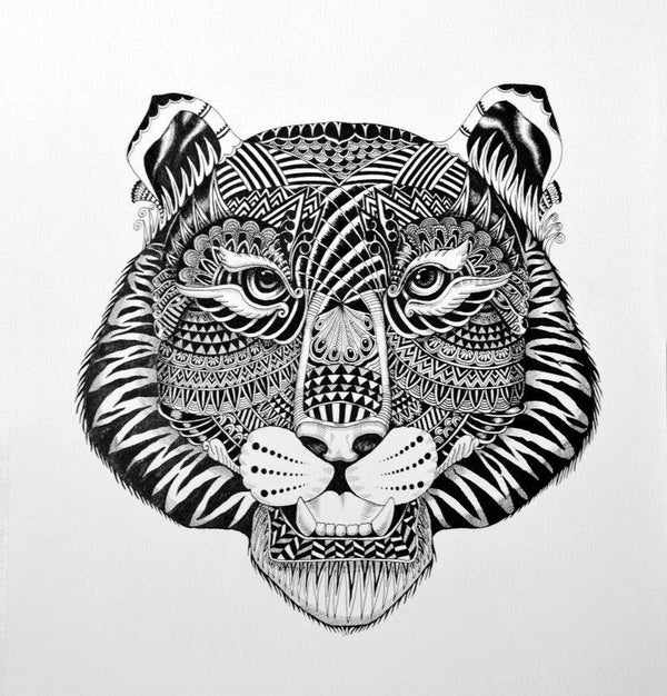 This captivating ink drawing portrays a zebra in profile, its distinctive stripes adorned with an intricate array of patterns and textures. The artist's meticulous hand has transformed each stripe into a miniature work of art, filled with delicate lines, dots, and geometric shapes. The zebra's serene expression and flowing mane evoke a sense of grace and elegance, while the overall composition celebrates the beauty and diversity of the natural world.